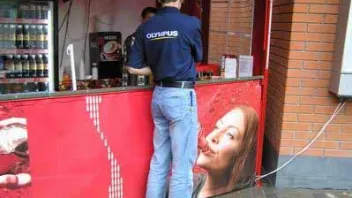 Der nächste Automat kündigte mit einem grossen Schild an: "Diese Maschine liefert das, was Männern am dringensten brauchen, wenn sie von ihren Frauen getrennt sind - 50 Cents". Der Vertreter sah sich um - niemand zu sehen - steckte 50 Cents in den Automaten, öffnete die Hose und steckte voller Vorfreude seinen Schwanz in die Öffnung. Als die Maschine anfing zu arbeiten schrie der Mann wie unter großem Schmerz. Als die Maschine 15 Seunden später stoppte konnte der Vertreter nur zitternd und mit Mühe seinen Schwanz aus der Maschine ziehen, ein Knopf war sauber am Ende des Schwanzes angenäht!