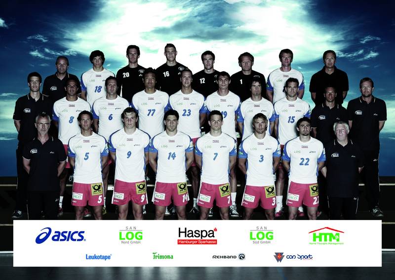 mittlere Reihe von links: Niklas Albers (Physiotherapeut), Bruno Souza (8), Iwan Ursic (6), Kyung-Shin Yoon (77), Pascal Hens (23), Krzysztof Lijewski (19), Roman Pungartnik (11), Guillaume Gille (15), Michael Bollhöfer (Co-Trainer), Martin Schwalb (Trainer)