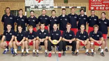 Die Bundesliga-Handballer der SG Leutershausen zeigen Flagge. Sie wollen in die 2. Bundesliga starten und hoffen, dass die Insolvenz noch abgewendet werden kann. Bis zur Bekanntgabe, wie es in Leutershausen weiter geht, trainiert das Team, besiegte gestern Abend Südwest-Regionaligist Nieder-Roden im Testspiel mit 28:25. Unser Bild zeigt stehend von links Trainer Uwe Rahn, Thomas Zahn, Klemens Kainmüller, Vice Kutlesa, Jan Vetrovec, Simon Kuch, Philipp Schulz, Tihomir Knez, Florian Schmitt und Physiotherapeut Stefan Schädler. Vorne von links sitzen Petr Hrachovec, Jonas Gunst, Fabian Müller, Christian Schemenauer, Rostislav Badura, Robbie Sowden, Jens Ostheimer und Sebastian Brehm.