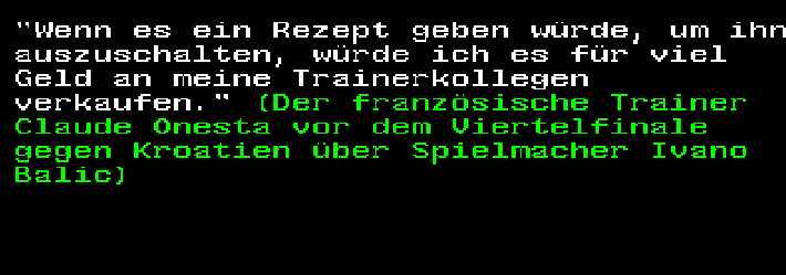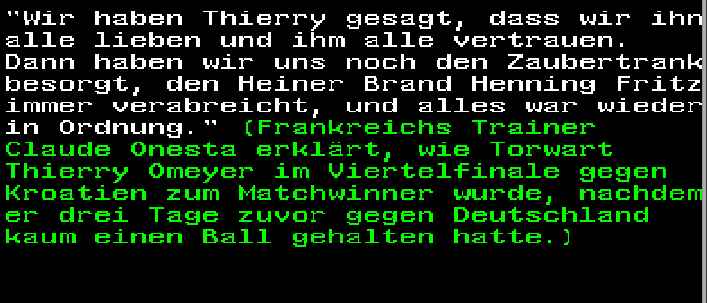 Wir haben aus dunklen Kanälen erfahren, welchen Zaubertrank Heiner Brand immer Henning Fritz vort den Spielen verabreicht. Den hat dann Thierry Omeyer auch bekommen(Claude Onesta zur Leistunfssteigerung der französichen Mannschaft, speziell von Omeyer, im Spiel gegen Kroatien)
