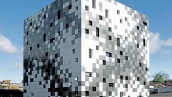 "Neben einer großen Prüf- und Messhalle im Erdgeschoß und einem nach oben offenen Atrium wurde hier Platz für 30 moderne Computerarbeitsplätze geschaffen. Die Fenster sind über die Fassade unregelmäßig verteilt und verleihen dem Gebäude dadurch eine auf den ersten Blick nicht wahrnehmbare Größe."