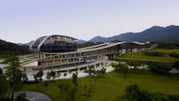 Its 480m long undulating form mirrors the topography of the landscape while its dragon-like shape, contemporary materials and function aim to refl ect the erudite language of education. Glazed façades encourage views out to the surroundings, while providing layers of sun-shading to reduce heat gain on library spaces within.