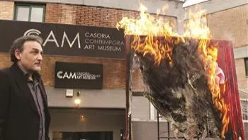 Das Museum leidet sehr stark unter den Sparmaßnahmen der italienischen Regierung. Der Museumsdirektor hat deshalb bei Angela Merkel Asyl für sein Museum beantragt. Da sie bisher noch nicht geantwortet hat, beginnt er jetzt ein Bild nach dem anderen zu verbrennen. Das erste musste schon dran glauben, was gestern bei uns in den Nachrichten gezeigt wurde.