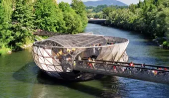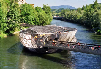 Das ist die Grazer Murinsel, in der Mur in Graz, Österreich!