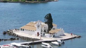 Das ist die Klosterinsel Vlacherna vor der griechischen Insel Korfu - direkt in der Einflugschneise des Flughafens!