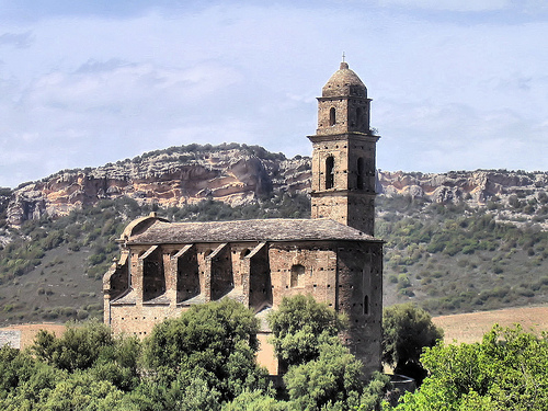 Es ist die Kriche St. Martin in Patrimonio, Korsika. Die im 13. Jahrhundert erbaute Kirche liegt im Herzen des Weinanbaugebietes auf der Mittelmeerinsel, einem der wichtigsten Anbaugebiete Frankreichs.