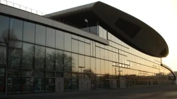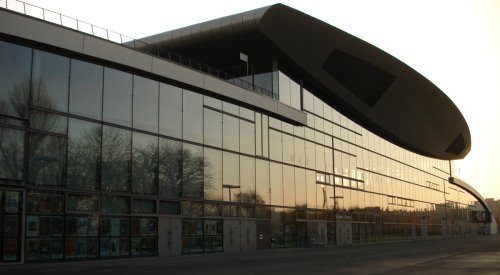 Das Gebäude gehört wohl zur aussterbenden Art der Rundsporthallen. Aber wo?Europa? Ja