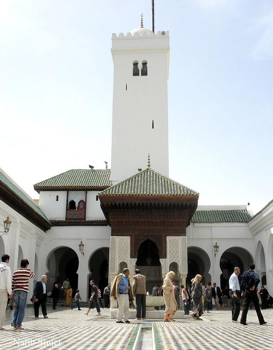 Es handelt sich um Die Al Karaouine Moschee in Fès, Marokko. Es ist die größte Moschee Nordafrikas, gegründet im Jahr 859 durch Fatima al-Fihri, die Tochter eines wohlhabenden Händlers namens Mohammed Al-Fihri. The Al-Fihri family war von Kairouan nach Fès gezogen, daher der Name der Moschee und auch der Universität, die sich dort befindet.