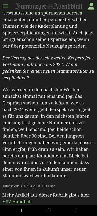 Danke erstmal dafür. Sehe ich ähnlich, dass sich das alles gut zueinander fügt. In Hamburg ist man vor allem froh und erleichtert, dass der "neue" HSVH was das finanzielle Gebaren angeht so gar keine Parallelen zum Rudolph-HSVH mehr aufweist. Man war hier zwar seit dem Neuanfang in Liga 3 recht guter Dinge und auch zuversichtlich, aber dass sich das jetzt auch in der dritten Saison in der Bel Etage so fortsetzt, gefällt allen im Umfeld des HSVH sehr, sehr gut nach meinem Dafürhalten.
