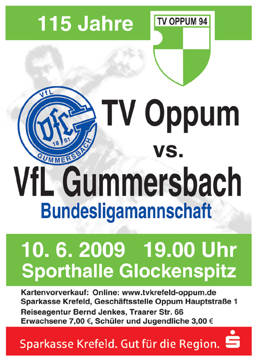 Der TV Krefeld-Oppum hat sein 115 jähriges Vereinsjubiläum und spielt am 10.6.09 gegen die Bundesligamannschaft des VFL Gummersbach!