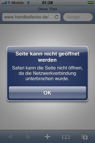 Mir passiert es immer wieder mal, dass ich die Handballecke vom iPhone aus nicht öffnen kann (Fehlermeldung siehe Anhang). Es ist aber nicht immer so, deswegen denke ich nicht, dass es an den Einstellungen meines Browsers liegt. Wenn ich nen WLAN-Zugang hab, funktioniert es immer. Nur über EDGE oder UMTS gibt es immer wieder mal Probleme. Dass passiert mir nur bei der Handballecke und beim Evergreens-Forum. Alle andere Seiten funktionieren normal.
