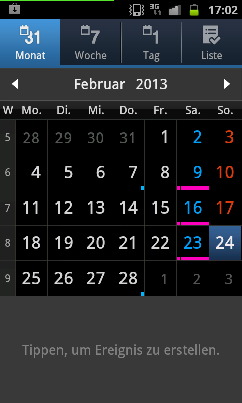 • ich habe ein SGS II mit Android 2.3.6(orig., kein root), Kalender ist über ICalSyn1.8h eingebunden