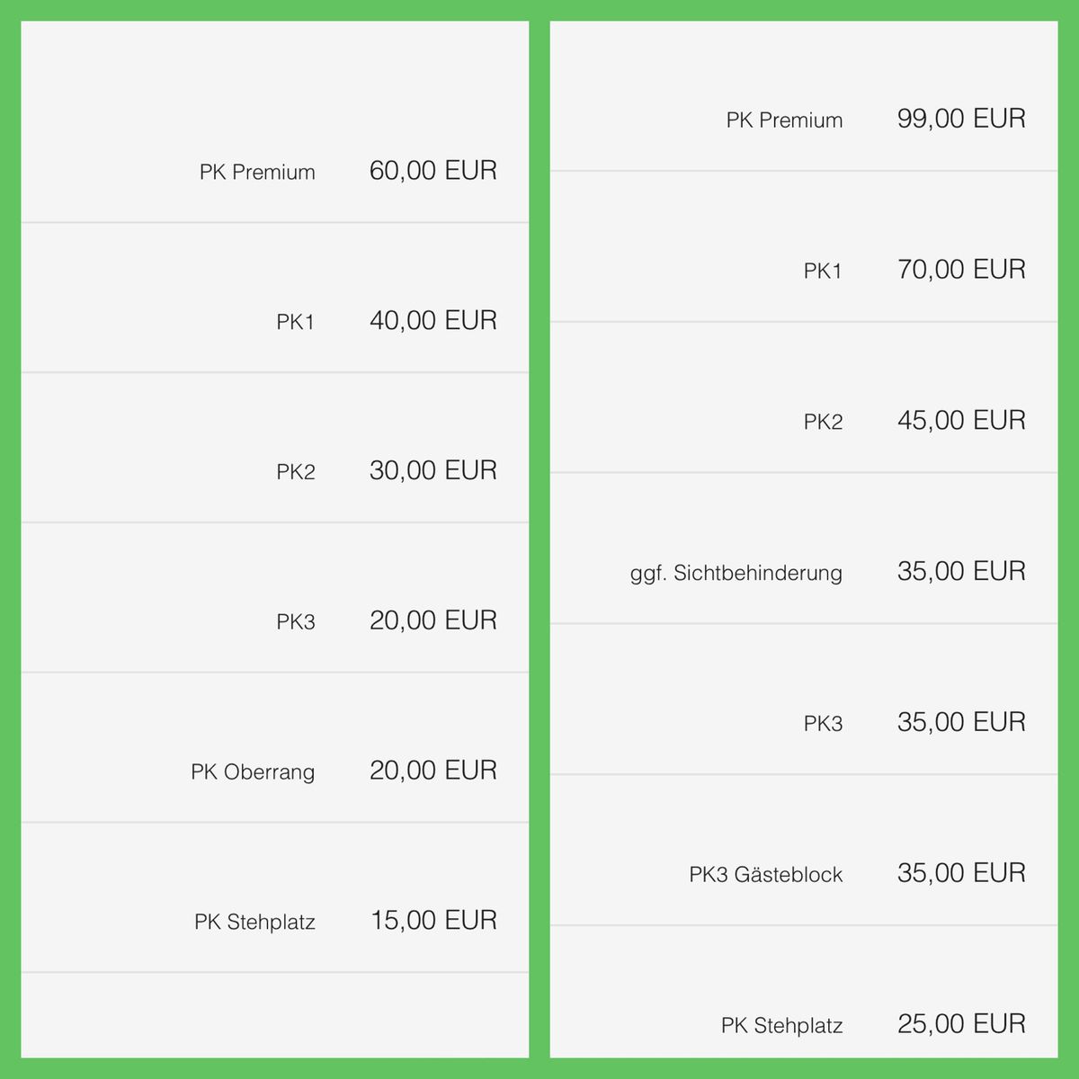 Bei Topspielen startet man bei 20 Euro für den Stehplatz und landet bei 99 Euro für den teuersten Sitzplatz im Block D/E. Wobei die Sitzplätze dann bei 30 Euro anfangen im Oberrang und den äußersten Ecken.