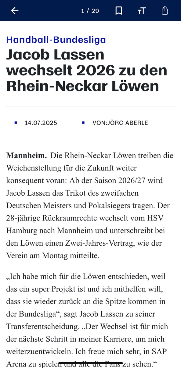 Jacob Lassen wechselt 2026 zu den Rhein-Neckar LöwenDie Rhein-Neckar Löwen treiben die Weichenstellung für die Zukunft weiter konsequent voran: Ab der Saison 2026/27 wird Jacob Lassen das Trikot des ...www.mannheimer-morgen.de -