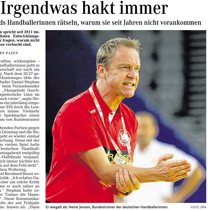 Sei mir nicht böse, Knecht, aber die Frage habe ich vor dem Interview gelesen und ich möchte ich nicht den Boulevard bedienen, auch wenn für einige von euch diese Frage sicherlich auf der Hand liegt. Alle, auch der Trainer, stehen noch unter dem frischen Eindruck eines schwachen Turniers, machen wir uns nichts vor. Auch ich bin im Spiel gegen Frankreich mehrmals an die Hallendecke gegangen, weil ich einige Sachen nicht verstanden habe. Dennoch steht in meinen Interviews immer die Sachlichkeit im Vordergrund. Ich bitte da um Verständnis. Ich bin mir sicher, dass ich bald wieder die Gelegenheit habe mit Heine zu sprechen, wenn er einige Dinge in Ruhe analysiert hat.
