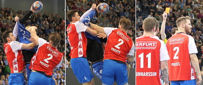 Szilagyi springt beim Torwurf weit in den Kreis, trifft Lichtlein und blockiert ihn, Ball prallt vom Pfosten ins Feld und Gutbrod netzt ohne Gegenwehr (Lichtlein liegt noch unter Szilagyi) den Abpraller ein.