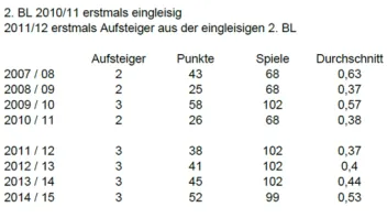 • Das Niveau der Aufsteiger ist ähnlich gebleiben... Ich habe aber den Eindruck, dass die heutige 2. Liga in der Breite stärker ist - es spielen sozusagen die Top 10 jeder Staffel. Davon werden die Aufsteiger natürlich nicht zwangsläufig besser.