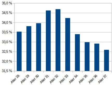 (Daten sind geglättet. Beispiel: Alter 31 umfasst auch 30 & 32. Für alle anderen Jahr entsprechend. Das verbreitert die Datenbasis und reduziert statistische Ausreißer.)