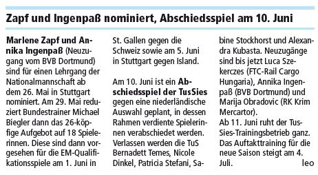 laut "Südwest Presse" vom 14.5. verlassen neben Temes und Dinkel auch Sabine Stockhorst, Patricia Stefani und Alexandra Kubasta die TusSies. Stefani und Kubasta dachte ich mir ja schon, aber Stockhorst??? Was ist denn da los? Bahnt sich da ein spektakulärer Torhüterwechsel an?