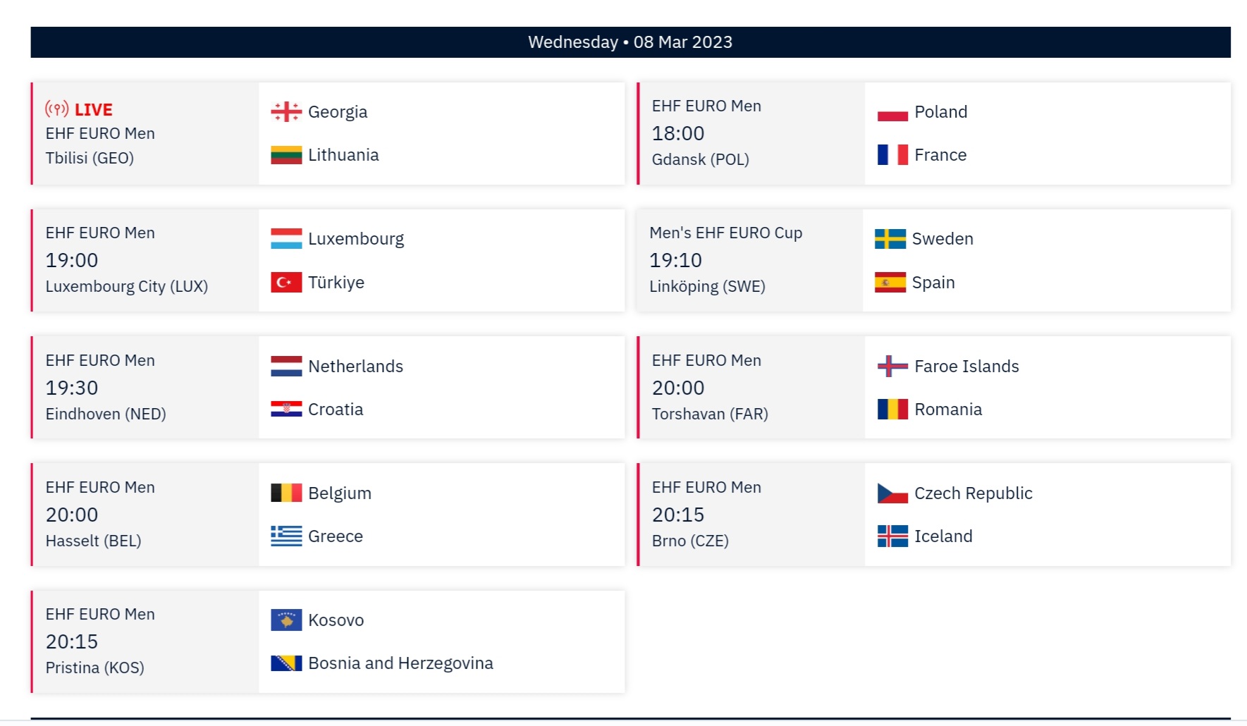 Am Donnerstag Teil 2 des 3. Spieltages der Gruppenphase der EM-Quali. Sicher auch ein paar Spiele die Spannung versprechen oder auch Überraschungen durch Außenseitersiege.