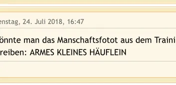 Kleiner Tip: wann habe ich die Mannschaft als "armes kleines" Häuflein bezeichnet ? Nenne mir das Datum und die dazugehörige Mannschaft. Rede keinen solchen Blödsinn, wenn du dich vorher nicht richtig informierst. Sonst wird der Hund in Pfanne verrückt.