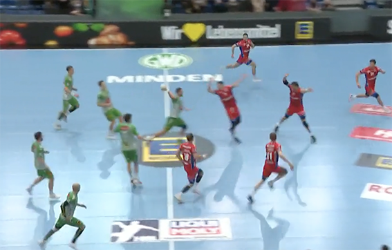 Für mich steht der Mindener mit einem Bein (leicht vor der imaginären Mittellinie, aber hier muss ein kleiner Toleranzbereich gelten, da die Linie ja gar nicht zu sehen ist), der Anwurf wird angepfiffen, dann hält Lipovina den Abstand nicht ein, stört den Ausführenden, und dann läuft der Mindener mit Ball über die Linie. Erst die regelwidrige Störung, dann die regelwidrige Ausführung!