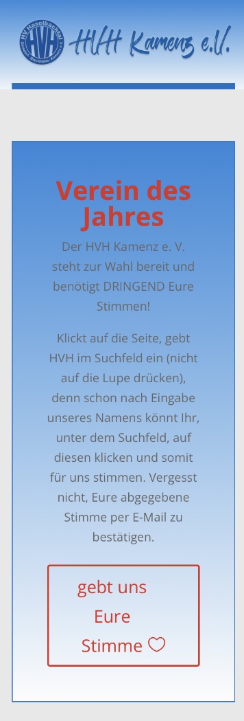 Im Suchfeld HVH eingeben (nicht auf die Lupe daneben klicken) und schon erscheint darunter unser Verein zum klicken. Bitte auch die Bestätigungsmail bestätigen, erst dann wird die Stimme gezählt.