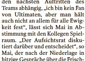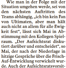 • Ich würde einen virtuellen Heiermann setzten, dass FAG bei Mayerhoffer vor der WM Pause die Reissleine zieht. Die Schönrederei vergrault vermutlich signifikant Zuschauer. Mir fehlt allerdings die Traineralternative.