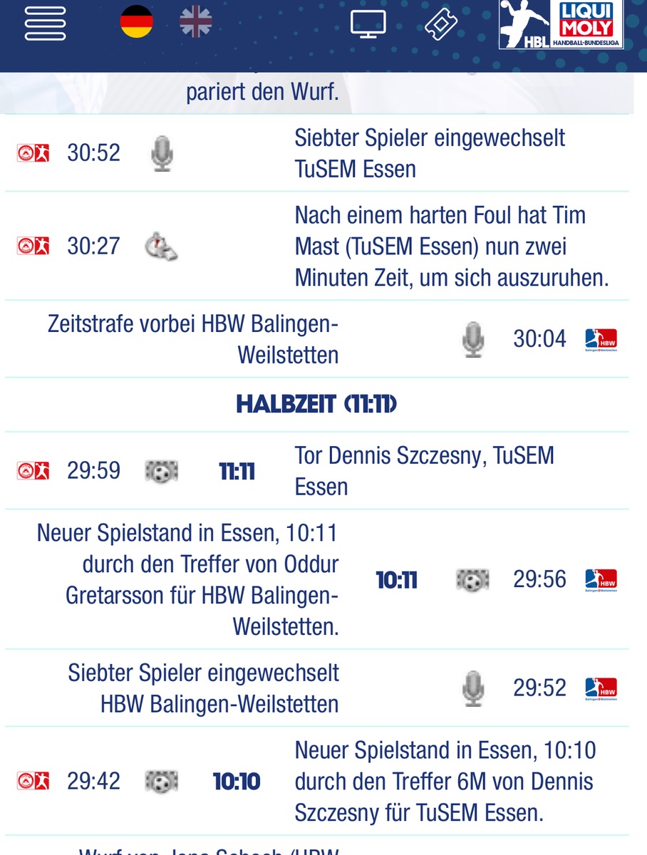 Vorhin beim Spiel Tusem-HBW wurde kurz vor der Pause nach dem Treffer zum 10:11 (1-2 sek) vor HZ 2 Min gegen Tusem gegeben und obwohl der Spieler noch auf dem Feld war wurde von den Schiris die schnelle Mitte zum 11:11 "erlaubt".