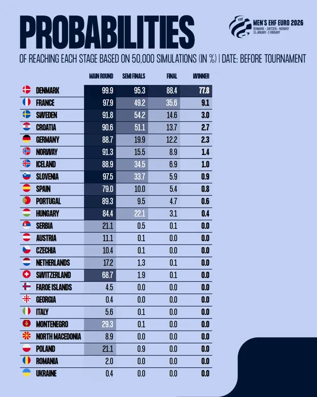 Zitat[... ]Based on the ratings from handballranking.com 50,000 simulations of the competition have been made. The share of a team winning the tournament or reaching the knockout stage or the main round in these simulations gives us the probability that they will win the tournament, go at least to the semi-finals or survive the preliminary round. [...]