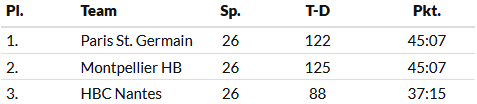 P.S.: In der Saison 2017/18 wurde Paris St. Germain französicher Meister aufgrund des gewonnenen direkten Vergleichs mit Montpellier, die die bessere Gesamt-Tordifferenz aufwiesen.