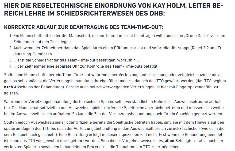 Es darf also schon ein Coaching gemacht werden, aber nicht auf den Feld, wie beim TTO. Würde es hier kein TTO geben, hättest du eine Hinausstellung wegen unberechtigtes Betreten eines Offiziellen (Regel 4:2) oder eines Spielers (4:6) geben müssen (außer für die 2 hereingerufenen Personen, die sich um den verletzten Spieler kümmern sollen. Dazu hat Arcosh den Regelbezug geschrieben).