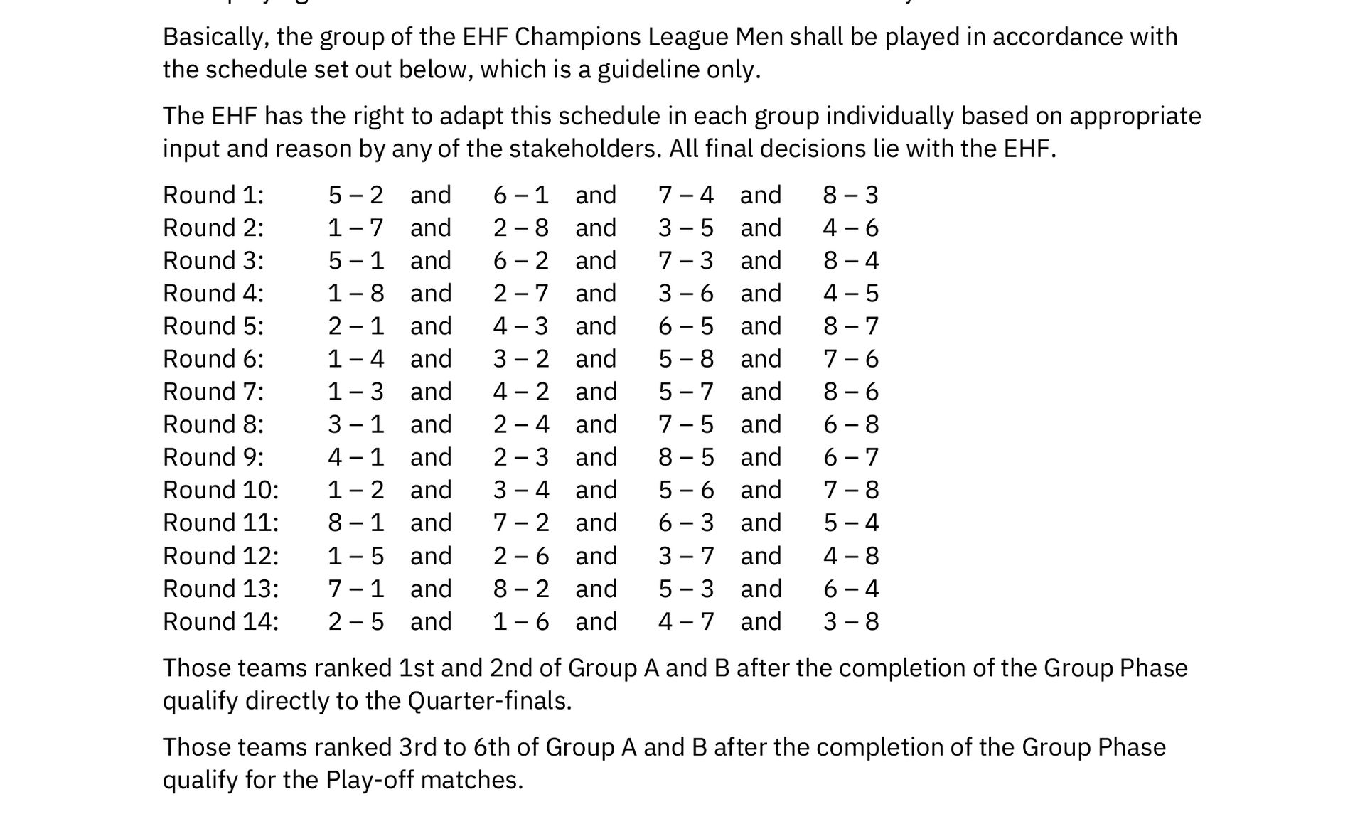 Zitat von EHFDie EHF hat das Recht, diesen Zeitplan in jeder Gruppe individuell anzupassen, basierend auf geeigneten Eingaben und Gründen seitens aller Beteiligten. Alle endgültigen Entscheidungen liegen bei der EHF. (übersetzte Version)