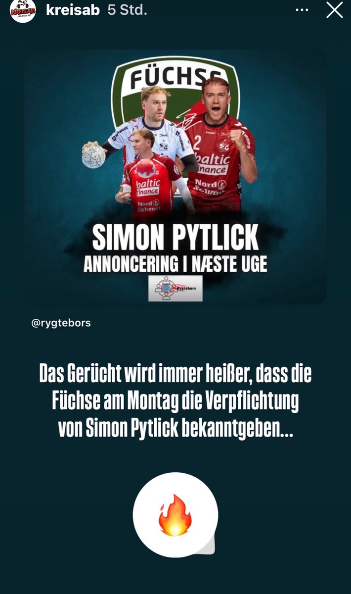 Wäre dann ja auch vertraglich interessant. Sollte der Wechsel für 2027 tatsächlich juristisch feststehen, sodass man ihn auch wirklich melden kann, dann müssten im Prinzip nicht nur Berlin und Pytlick einen Vertrag haben, sondern wahrscheinlich auch die Füchse mit der SG die Zahlung der festgeschriebenen Ablöse fest vereinbart haben. Also wäre die SG involviert. Die Füchse können schlecht einen Transfer als fix bezeichnen, wenn sie bisher nur die Absicht haben, die Ablöse zu bezahlen.
