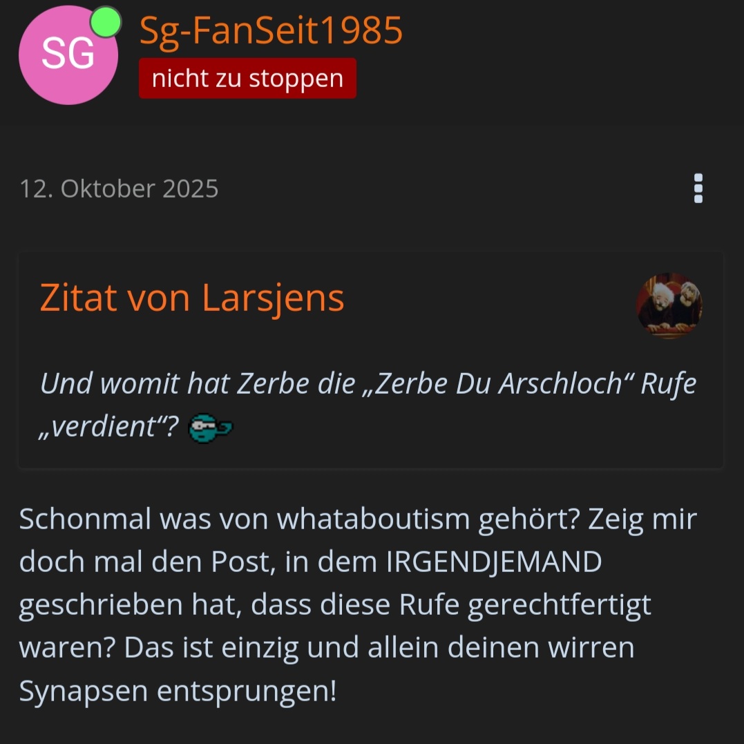 Meiner aber, jetzt kabbeln sich mehrere User mit über Ton macht die Musik. Seit der Thread offen ist, gibt es keinen einzigen Post der das Thema betrifft oder nicht nur alles wiederholt was im Wechselgerüchtethread steht. Außer über Bande SG-Fans provozieren hat das hier wenig Zweck.
