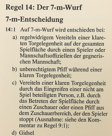 Gidsel muss nach rechts abknicken um am im Kreis stehenden Pytlick vorbeizuwerfen. Das ist zum Zwecke der Abwehr im Kreis. Zeig die Szene auf einer Schirifortbildung und 95% sagen das ist 7m.
