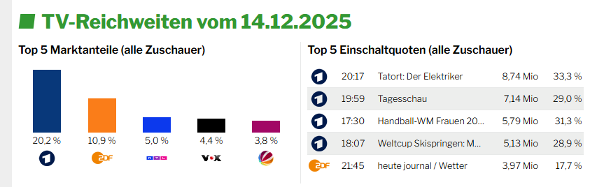 Ich wage mal die These, dass die DHB-Damen seit der Wiedervereinigung noch nie 5,79 Mio. Zuschauerrund über 30 Prozent hatten.
