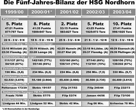 Eine Konstante im HSG-Team ist Rechtsaußen Jan Filip: Zwar erzielte der tschechische Nationalspieler mit 232 Treffern weniger Tore als in der vergangenen Saison, seine Ausbeute war damit aber immer noch höher als die der besten Nordhorner Torschützen in den ersten drei Bundesliga-Spielzeiten. Filip ist auch der beste Schütze bei Siebenmetern, er wandelte fast dreiviertel (73 von 100) aller Versuche von der Strafwurf-Markierung. Die Zahl der erzielten Treffer war mit 998 größer als in der Spielzeit 1999/2000 (877) und im Jahr der Vizemeisterschaft 2002 (983).