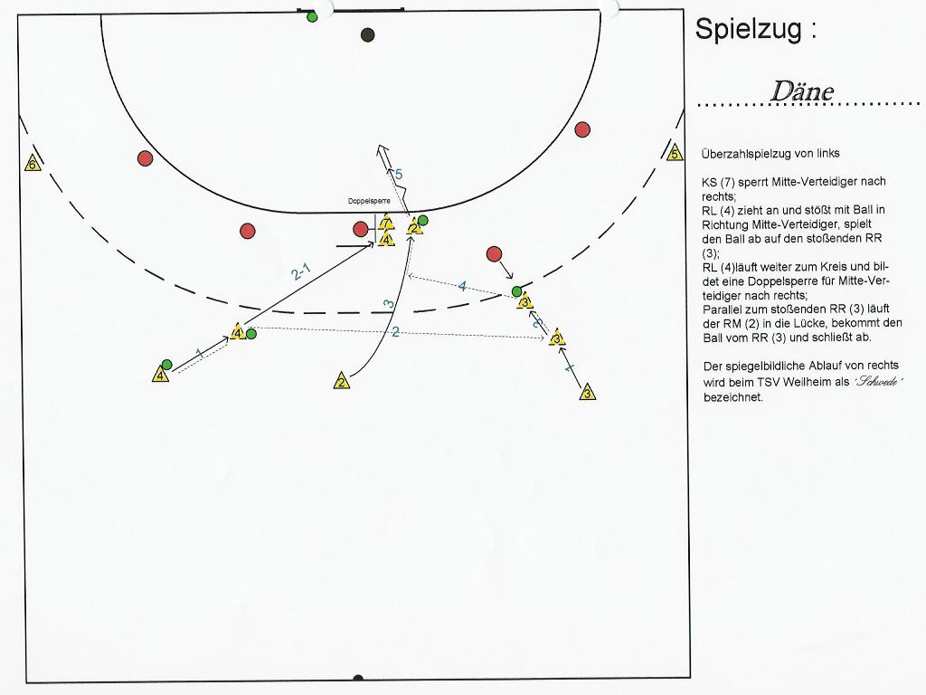 2. keine Ahnung wie der Spielzug heißt: Beim Ballbesitz laufen 5 Spieler im Pulk von der Mittellinie aus auf eine Naht in der Abwehr zu. Der 6. Spieler läuft mit dem Ball hinter dem Pulk hinterher. Ab dem 9m-Kreis löst sich der Pulk auf. Die Abwehr wird so verwirrt von dem auf sich zulaufenden Pulk sein, dass sie so schnell nicht reagieren können, sodass ein Tor erzielt werden kann.