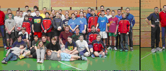 [QUOTE] E- und D-Jugendalters. Bis zum Dienstag, den 04.02.05 standen acht Trainingseinheiten, ein Abschlussturnier, zwei Freizeitabende, zwei Übernachtungen und sieben vollwertige Mahlzeiten auf dem Programm. Themenschwerpunkte waren die Verbesserungen der Tipp-, Wurf- und Fangtechniken, die Vermittlung von Abwehrkompetenzen und die Verbesserung der allgemeinen Koordination. Ebenfalls sollten weitere handballerische Elemente, wie das Kreuzen, der Tempogegenstoß sowie Täuschungen aller Art vermittelt werden. Als Höhepunkt konnte am Dienstag morgen der südbadische Mädchenauswahltrainer Arnold Manz gewonnen werden, der mit den Kids eine Einheit mit dem Schwerpunkt „Kleingruppen- und Sektorenspiele“ durchführte.