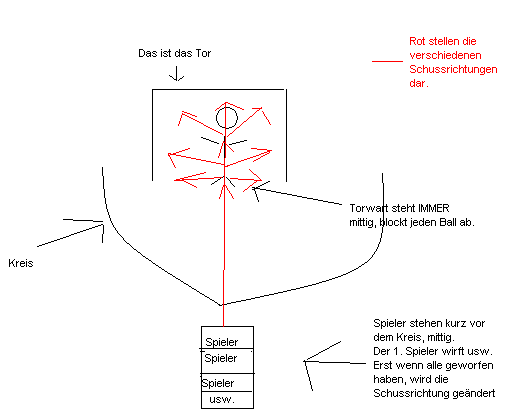 Alle Spieler außer dem Torwart nehmen sich einen Ball, stellen sich in der Mitte vors Tor in einer Reihe, als erstes wird mittig, ein Stück über dem Kopf geworfen, der Torwart lässt dauerhaft seine Hände oben und blockt den Ball zur Seite. Dann wird links oben und rechts oben geworfen, der Torwart blockt wieder ab, nur macht er jetzt die Abwehrbewgung von der Mitte aus, also wie im Spiel, wo man nicht weiß wo der Ball hinfliegt.